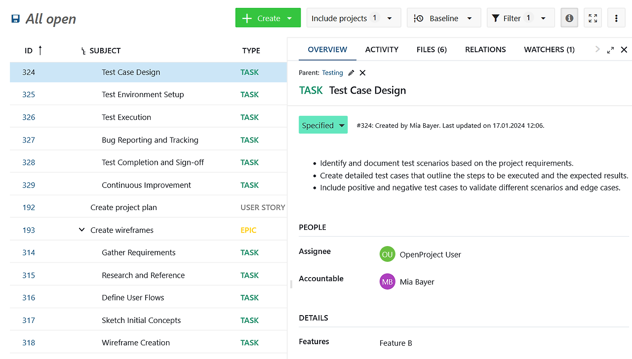 OpenProject는 다음과 같은 주요 기능을 제공합니다: