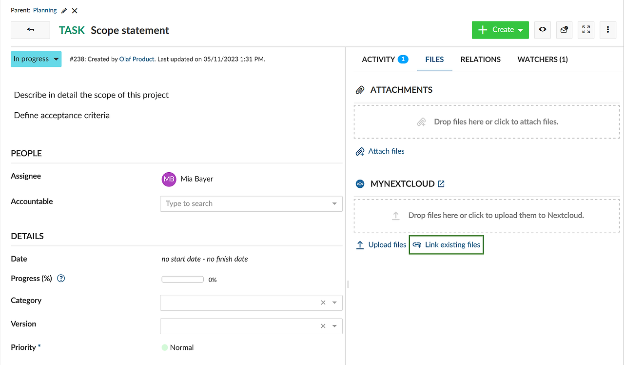 - NextCloud에 저장된 파일과 폴더를 OpenProject의 작업 패키지에 연결할 수 있습니다.