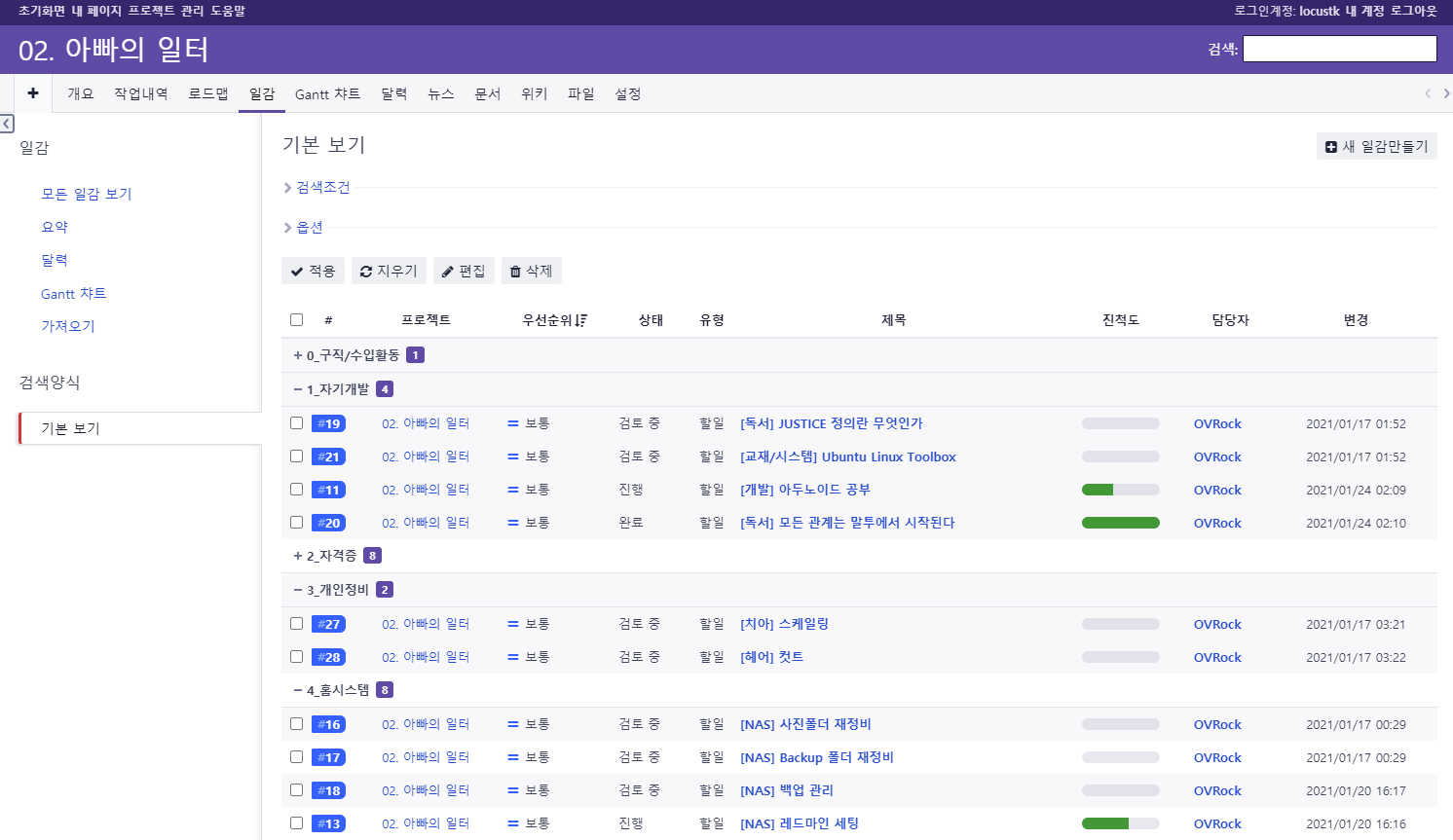 개인적으로도 별도로 레드마인을 구축하여 사용하고 있습니다. 구글/아이클라우드/드롭박스/다음클라우드/네이버 등에 개인적인 일부터 다양한 파일들을 생성하고 저장해온터라 나름은 정리를 깔끔히 한다고 믿어왔지만, 흩어져 있는 시간이 많이 흐르다보니 과거의 기록을 찾기에는 이미 이곳 저곳 흩어져 있어서... 좀처럼 쉽지 않았기 때문에 사건/사고 등을 기록하여 관리하는 것을 올해부터 기록하고 있습니다. (일감의 범주, 유형 등을 변형하여 활용)