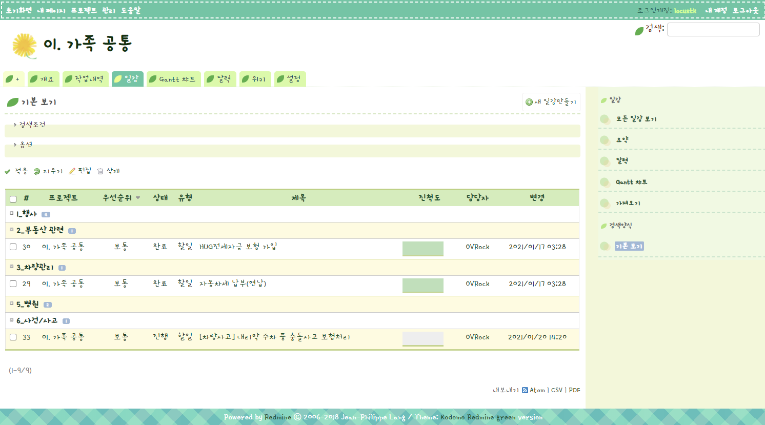개인적으로도 별도로 레드마인을 구축하여 사용하고 있습니다. 구글/아이클라우드/드롭박스/다음클라우드/네이버 등에 개인적인 일부터 다양한 파일들을 생성하고 저장해온터라 나름은 정리를 깔끔히 한다고 믿어왔지만, 흩어져 있는 시간이 많이 흐르다보니 과거의 기록을 찾기에는 이미 이곳 저곳 흩어져 있어서... 좀처럼 쉽지 않았기 때문에 사건/사고 등을 기록하여 관리하는 것을 올해부터 기록하고 있습니다. (일감의 범주, 유형 등을 변형하여 활용)