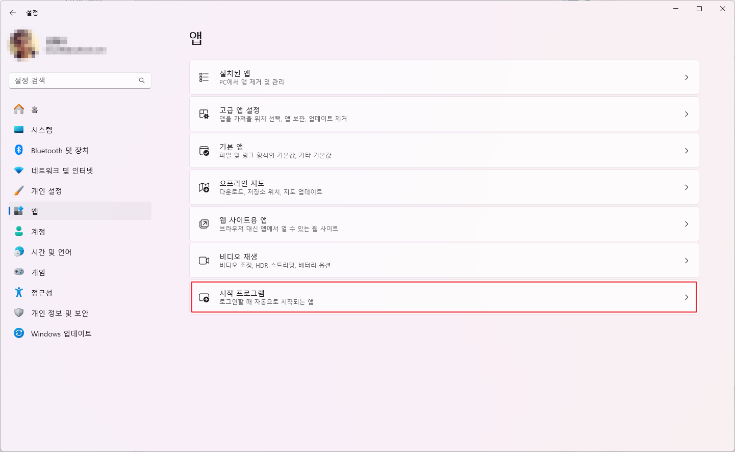 설정 앱을 실행하고, 시작 > 앱 > 시작 프로그램 실행 후 프로그램 토글