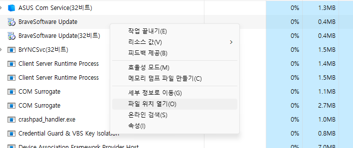 프로세스을 찾았다면, 해당 프로세스를 식별하기 위해 오른쪽 마우스 클릭한다음 파일 위치 열기를 클릭 한다음 해당 프로그램이 어떤 프로그램인지를 알 수 있습니다. 삭제를 해주거나 중지해줘야겠지요.