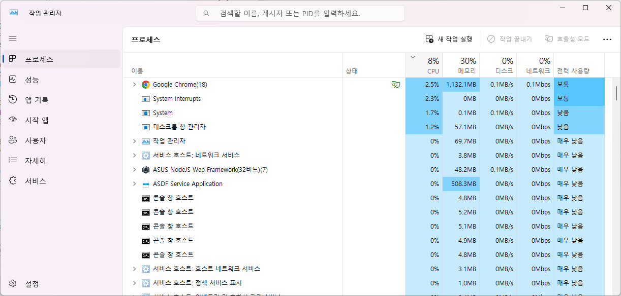 Win+Esc 작업 관리자를 열어서, 사용간에 가장 높은 프로세스, 메모리, 디스크 이름을 지속적으로 확인하고, 해당 프로세스를 찾습니다.