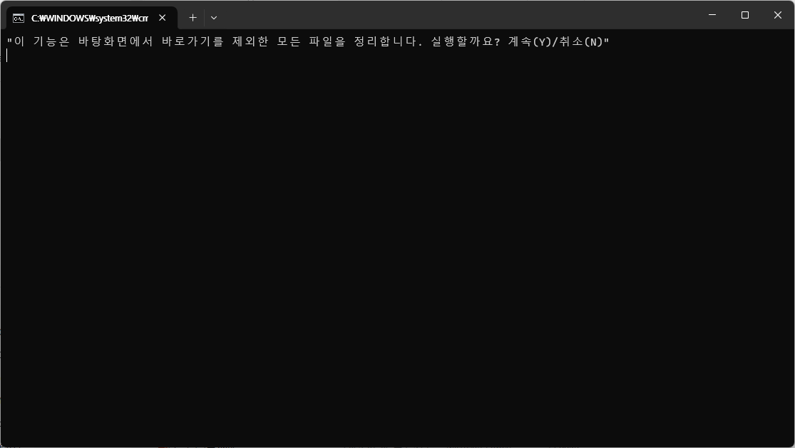 - "이 기능은 바탕화면에서 바로가기를 제외한 모든 파일을 정리합니다. 실행할까요? 계속(Y)/취소(N)" 메시지를 보여주고 입력을 받아. Y를 선택하면 계속 진행하고, N을 선택하면 종료