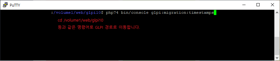 그리고, glpi가 설치된 경로로 이동해서, 명령어를 입력합니다. (glpi의 경로는 이때 web의 경로에 따라 경로가 달라질 수 있습니다)