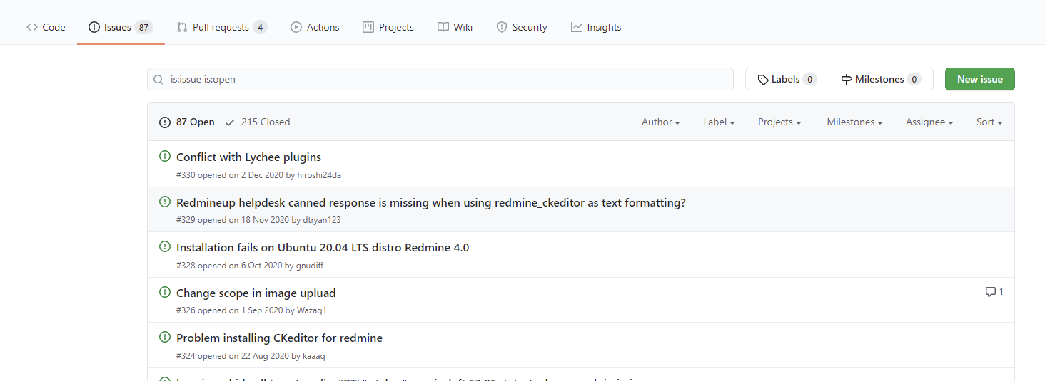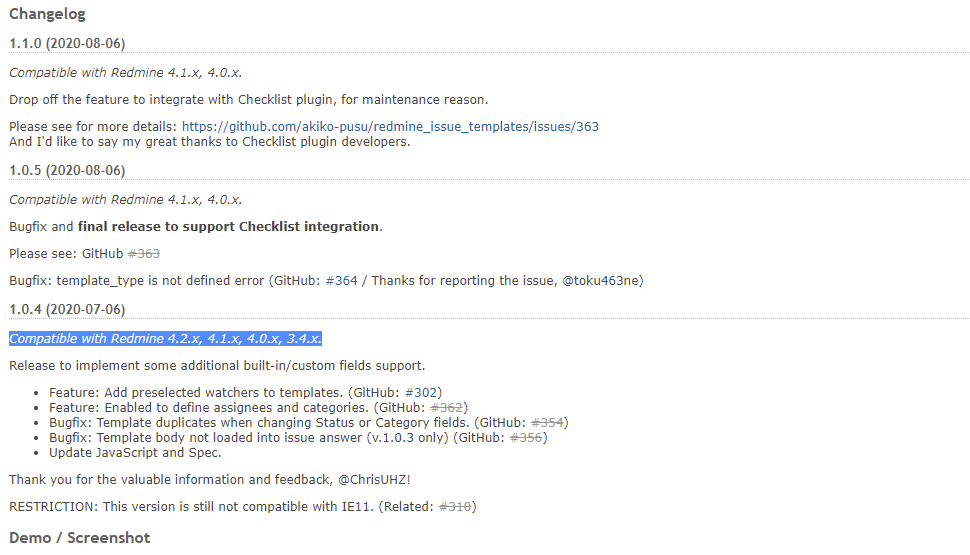 - 대다수의 플러그인은 Redmine.org의 사이트에 Compatible 버전을 표기하고 있습니다. 해당 버전에 맞는 Tag를 Git에서 검색하세요.)