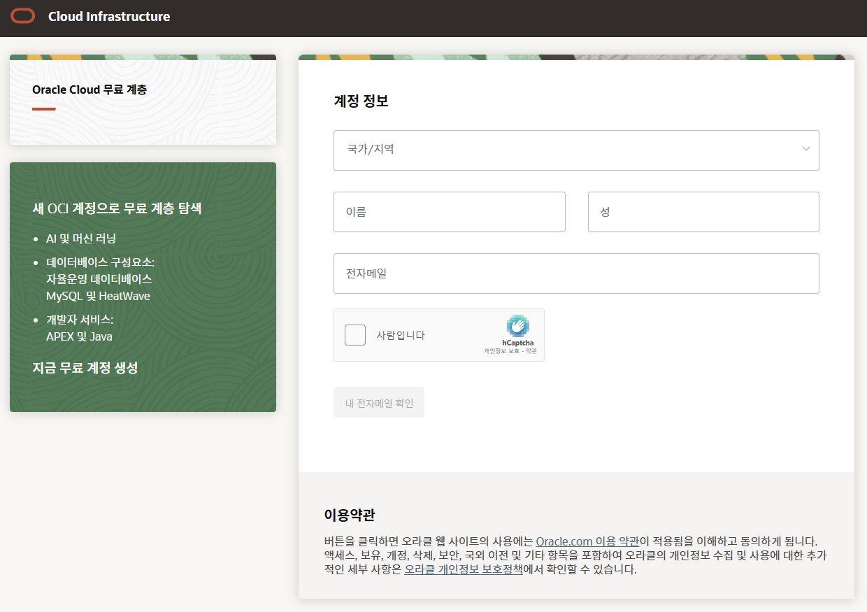 - https://www.oracle.com/cloud/free 에 접속하여 가입