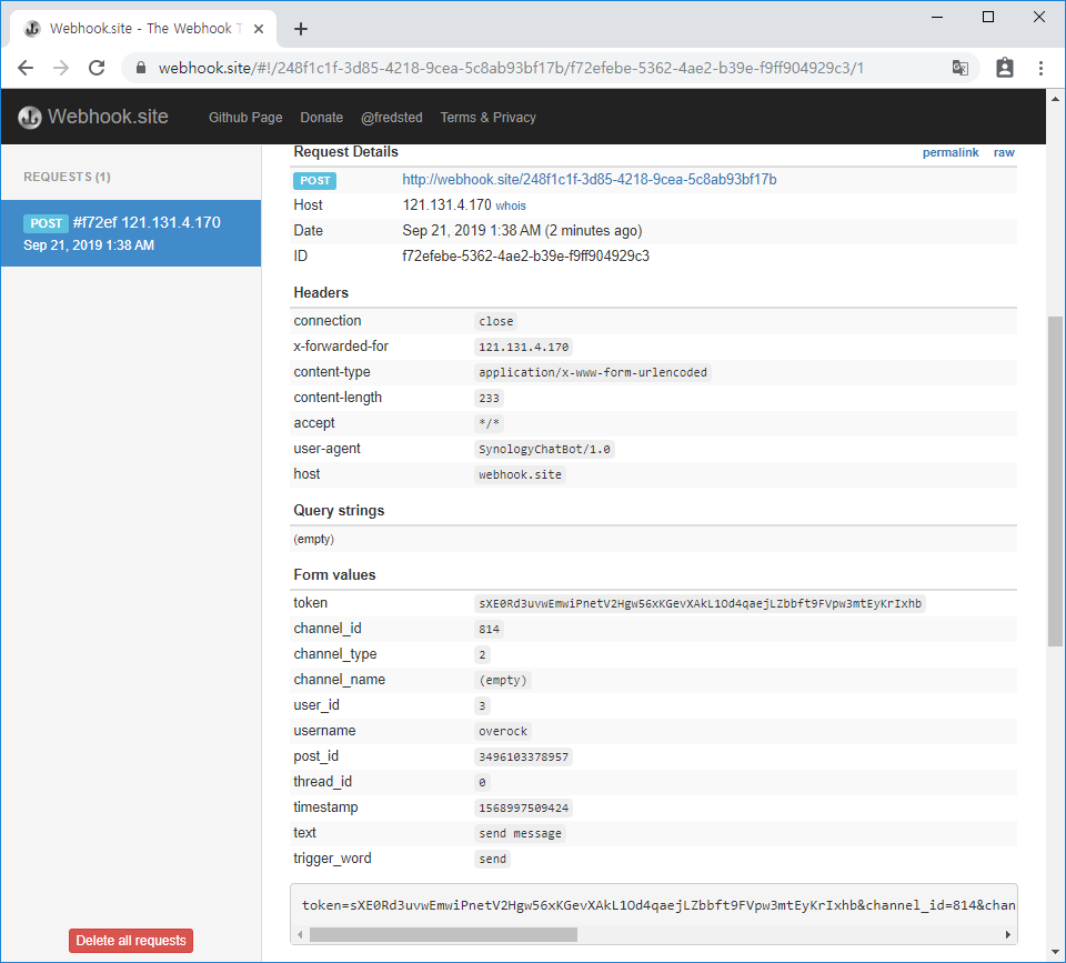 Webhook 테스트 사이트 결과 확인