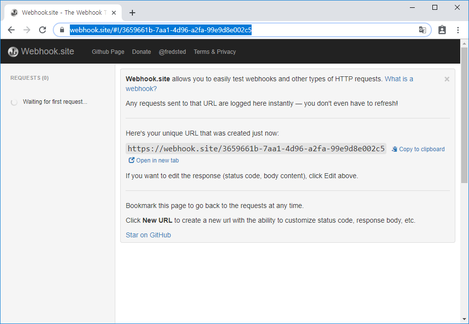 서비스에 접속하면, Webhook이 수신받을 수 있는 URL이 생성됩니다. URL을 복사합니다.