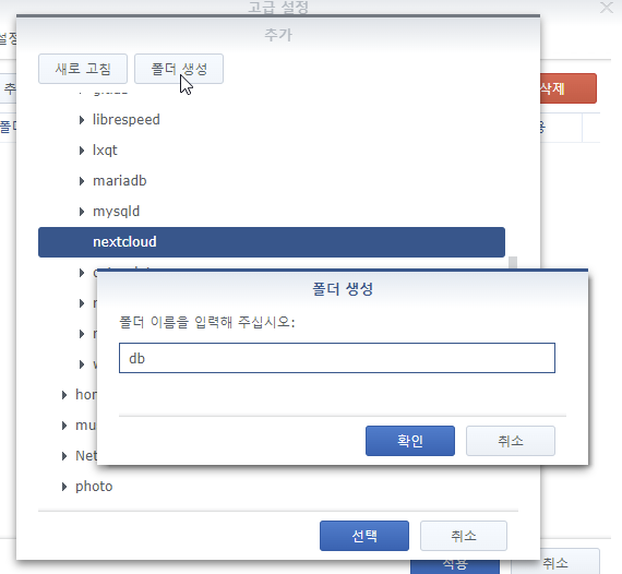 ⑥ nextcloud 이미지를 실행하고, 일반 설정의 내용중 고급설정을 클릭하고, 입력하는 상세정보는 dockercompose.yml 파일을 참고합니다.