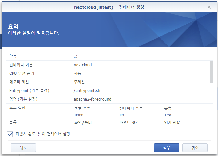 ⑦ nextcloud 컨테이너 생성에 최종적으로 내용을 확인하고, 적용을 클릭합니다.