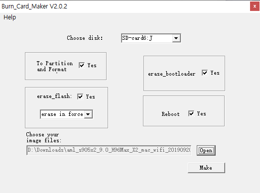 3. 이제 펌웨어 생성하기 위해 SD카드를 컴퓨에 연결해주시고 다음의 옵션을 선택해주고 Make 버튼을 누릅니다.