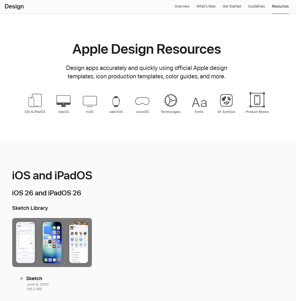 애플은 iOS, iPadOS, macOS, watchOS, visionOS 등 다양한 플랫폼에 대한 공식 디자인 템플릿과 UI 키트, 아이콘, 컴포넌트를 제공합니다. Sketch, Figma, Adobe XD 등 주요 디자인 툴 포맷으로 제공되며, HIG(Human Interface Guidelines)도 함께 참고할 수 있어 매우 유용합니다. (Sketch로 제작된 iOS 26 라이브러리가 이미 업데이트되어 있습니다.)