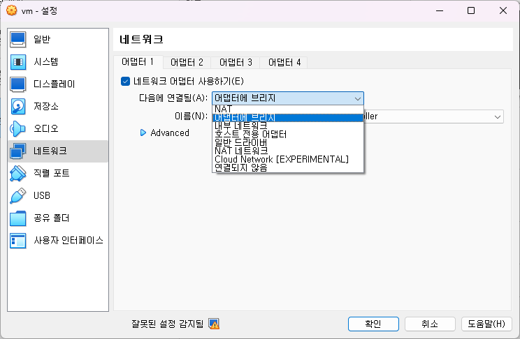 4. 설정을 누르고 네트워크 어댑터를 '어댑터에 브리지'로 선택하고, 현재 인터넷에 연결된 장치를 선택하고 확인을 누릅니다.