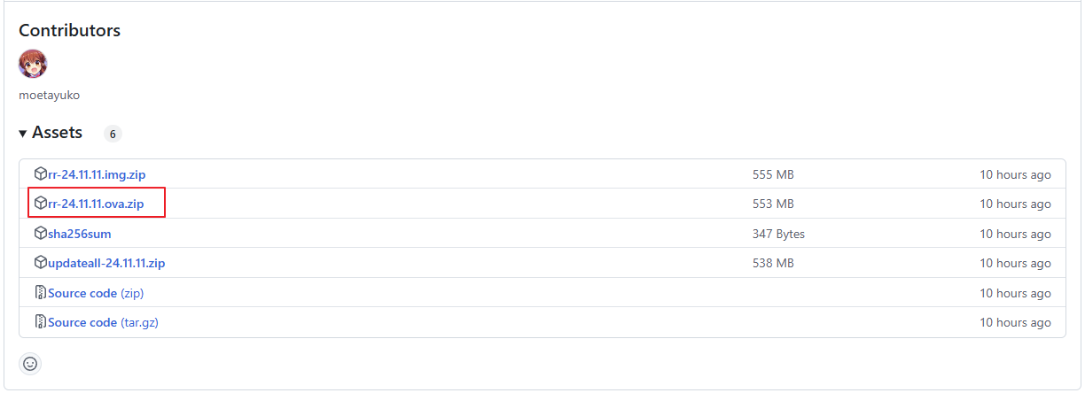 2. Github 페이지에 접속하여 Release 항목을 클릭하고, 버전의 Assts 에서 rr-버전.ova.zip 파일을 다운로드 합니다.