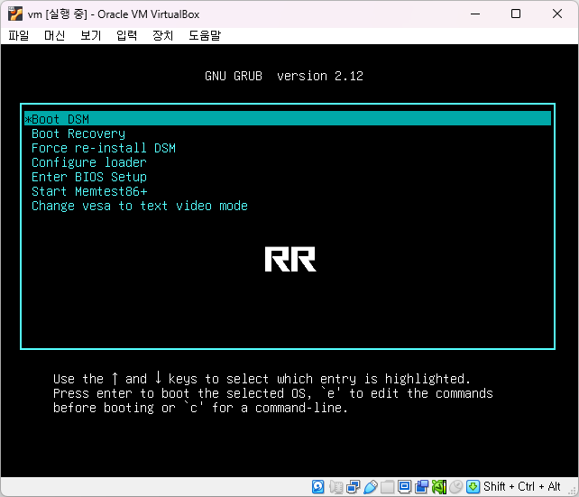 6. 시스템이 시작되면, GRUB 메뉴가 뜨는데 Boot DSM 상태에서 부팅합니다.
