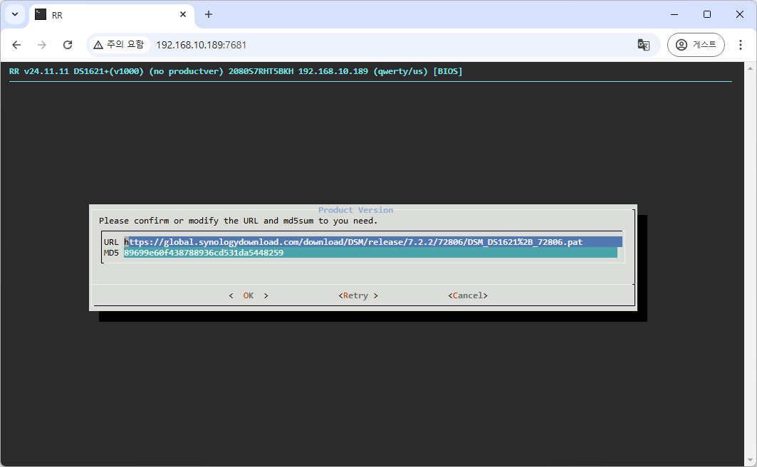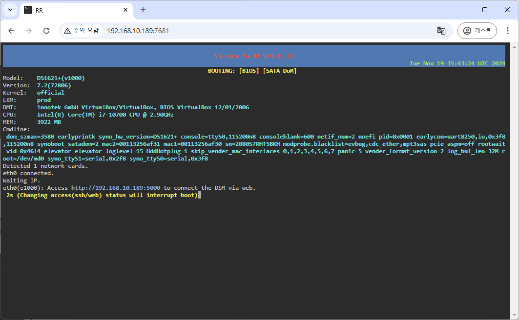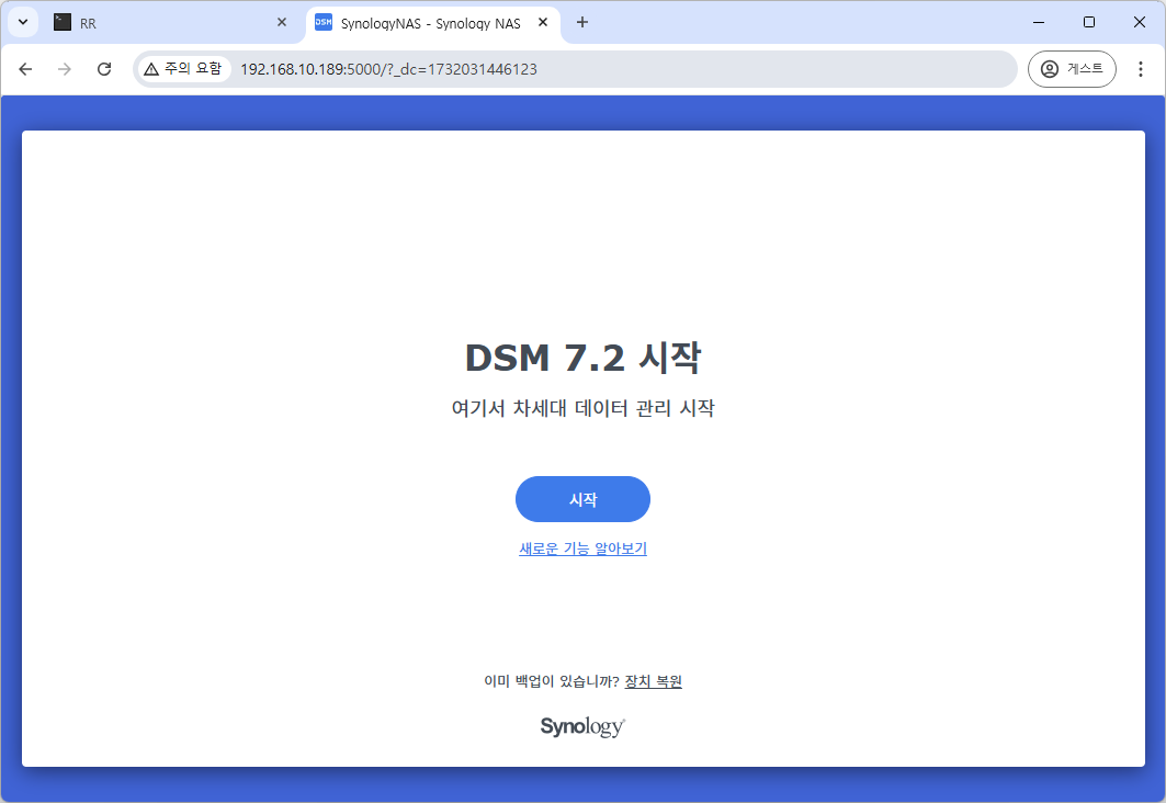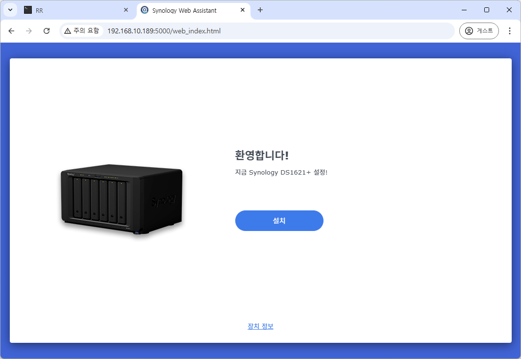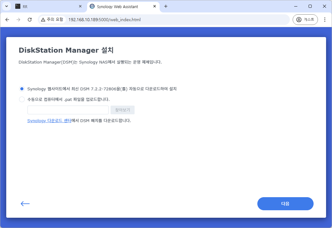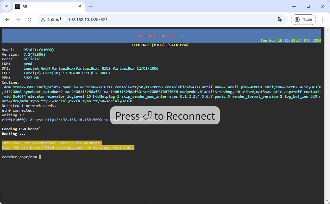 9. Reconnect를 누른뒤 새창을 띄워 http://아이피:5000 으로 접속하면, DSM 초기 세팅 화면을 확인 하실 수 있습니다.