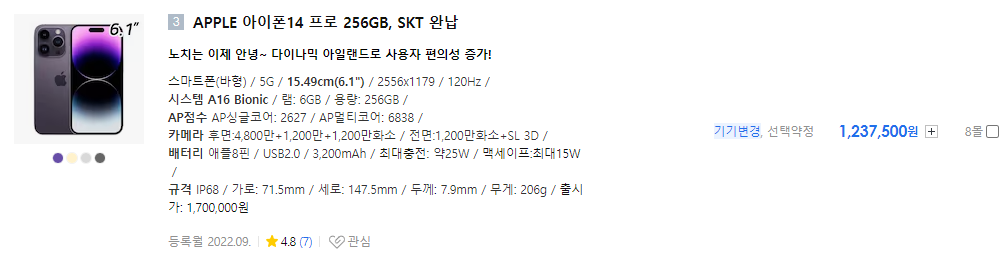 - 아이폰 14 Pro의 가격(256GB 기준 ₩1,700,000)은 아이폰 15 Pro보다 15만원 저렴함.