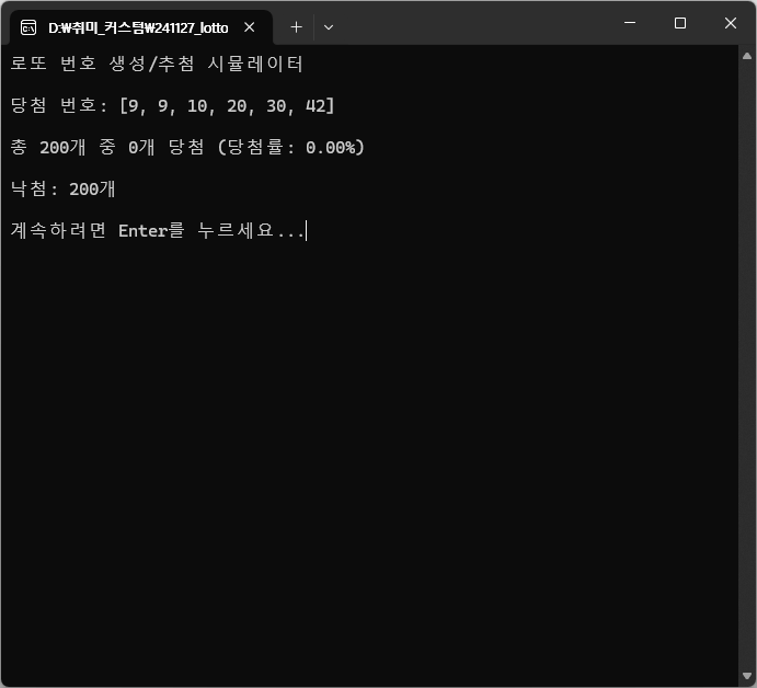 print(f"\n총 {total_sets}개 중 {winning_sets}개 당첨 (당첨률: {win_rate:.2f}%)")