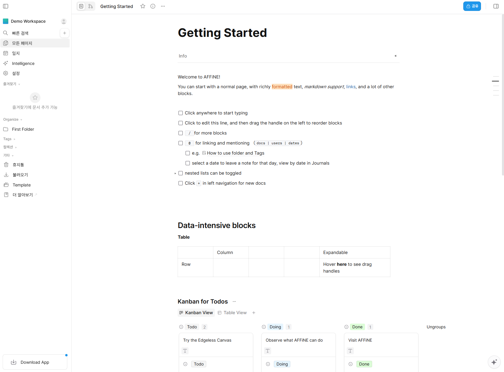 - ✅ 블록 기반 에디터 + 화이트보드 + 테이블 기능 통합